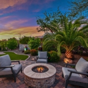 Beautifully appointed 1,682 square foot home offering 2 Bed, 2 Bath, + Den with Murphy Bed, ideally positioned on a private cul-de-sac lot with adjacent 70 foot desert space for added serenity and openness. The private and lush backyard is designed for relaxation and entertaining, featuring an extended paver patio, synthetic grass, gas fire pit, tranquil water feature, stone accent wall, and gas line for BBQ. Inside, the Great Room showcases updated large format tile floors, a striking stone entertainment wall with electric fireplace, and French sliders leading to the covered patio for seamless indoor-outdoor living. The kitchen is both stylish and functional with granite counters, stainless appliances, and a designer tile backsplash. Enjoy morning coffee in the charming front courtyard.