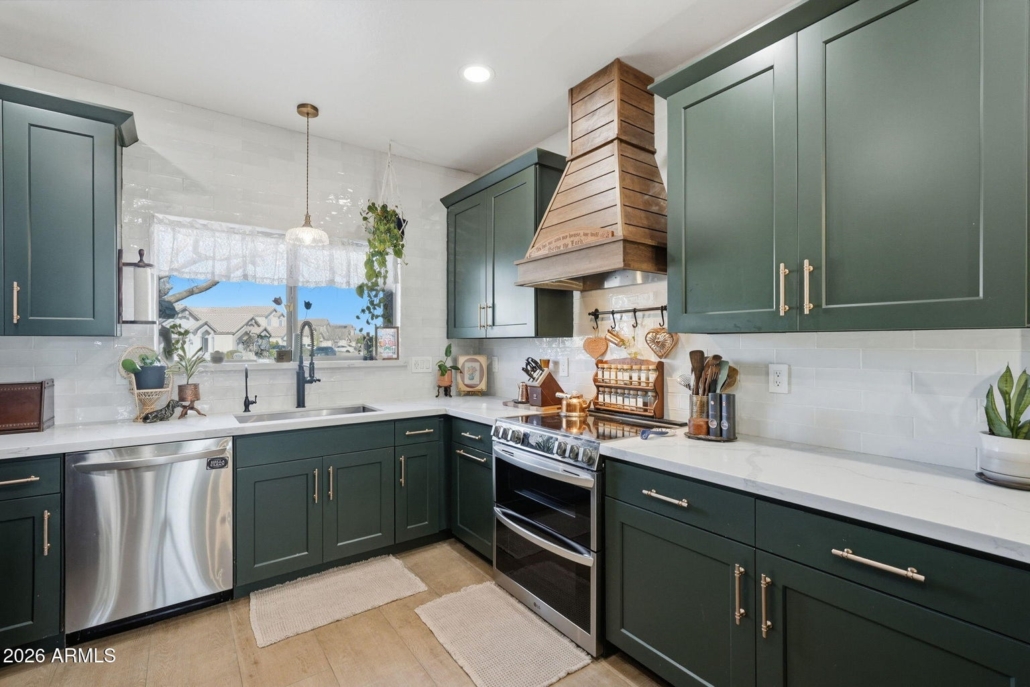 Exquisitely remodeled 2-story, 4-bedroom, 2.5-bath residence located in the sought-after Desert Harbor community of Peoria. Set on an oversized corner lot, this home seamlessly blends elevated design, thoughtful functionality, and inviting warmth—delivering a truly turnkey living experience. The main level showcases all-new wood-look tile flooring, fresh interior and exterior paint, new baseboards, upgraded lighting, and new ceiling fans throughout. The dramatic living room serves as a striking focal point, featuring a brand new custom two-story fireplace with electric insert, flanked by new built-in cabinetry and enhanced by newly added recessed lighting for an airy, light-filled ambiance. The kitchen has been beautifully reimagined with refaced cabinetry and custom hood, a full-height