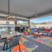 An extended patio sets the stage for outdoor living, complete with a fully equipped kitchen featuring a built-in gas grill, Komodo grill, beverage cooler, and refrigerator. The space continues with expansive turf areasideal for entertaining, play, or simply relaxing under the desert sky.
